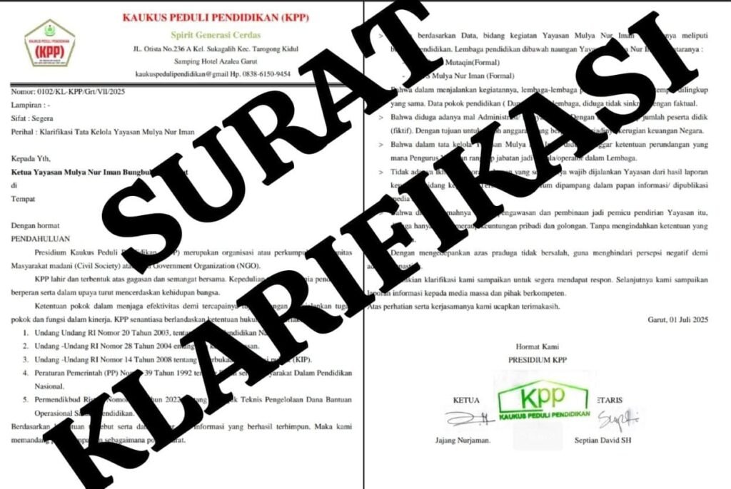 GARUT.Fajarnewsgarut.online – Dunia pendidikan di wilayah selatan Garut kembali diwarnai dengan polemik serius. Kaukus Peduli Pendidikan (KPP) resmi melayangkan surat klarifikasi kepada Ketua yayasan Mulya Nur Iman diantara MI Darul Mutaqin dan MTS Mulya Nur Iman yang berlokasi di Kecamatan Bungbulang, Kabupaten Garut. Surat nomor: 0102/KL-KPP/Grt/VII/2025 dan bertanggal 1 Juli 2025 tersebut dilayangkan sebagai respon atas dugaan kuat terjadinya maladministrasi serta praktik mark-up data peserta didik yang berpotensi merugikan keuangan negara.