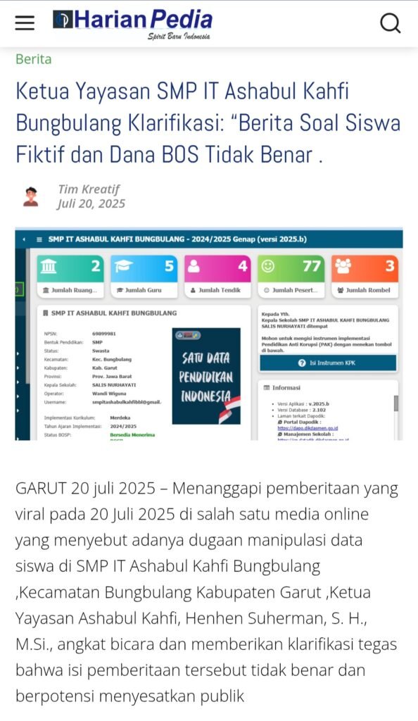 Dalam klarifikasi yang disampaikan oleh Ketua Yayasan SMP IT Ashabul Kahfi, Henhen Suherman, S.H., M.Si., ia menyebut bahwa pemberitaan terkait dugaan siswa fiktif dan pencairan Dana BOS yang tidak sesuai jumlah murid adalah tidak benar, menyesatkan, dan tidak melalui konfirmasi yang utuh. Bahkan pihak yayasan berencana menempuh jalur hukum atas pemberitaan tersebut.